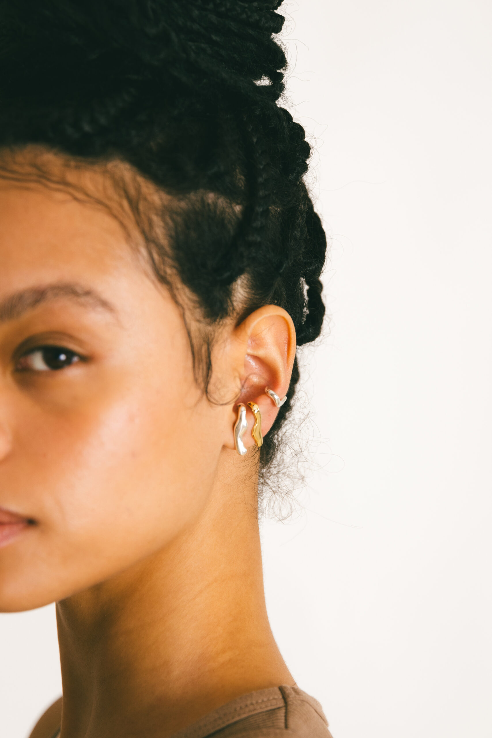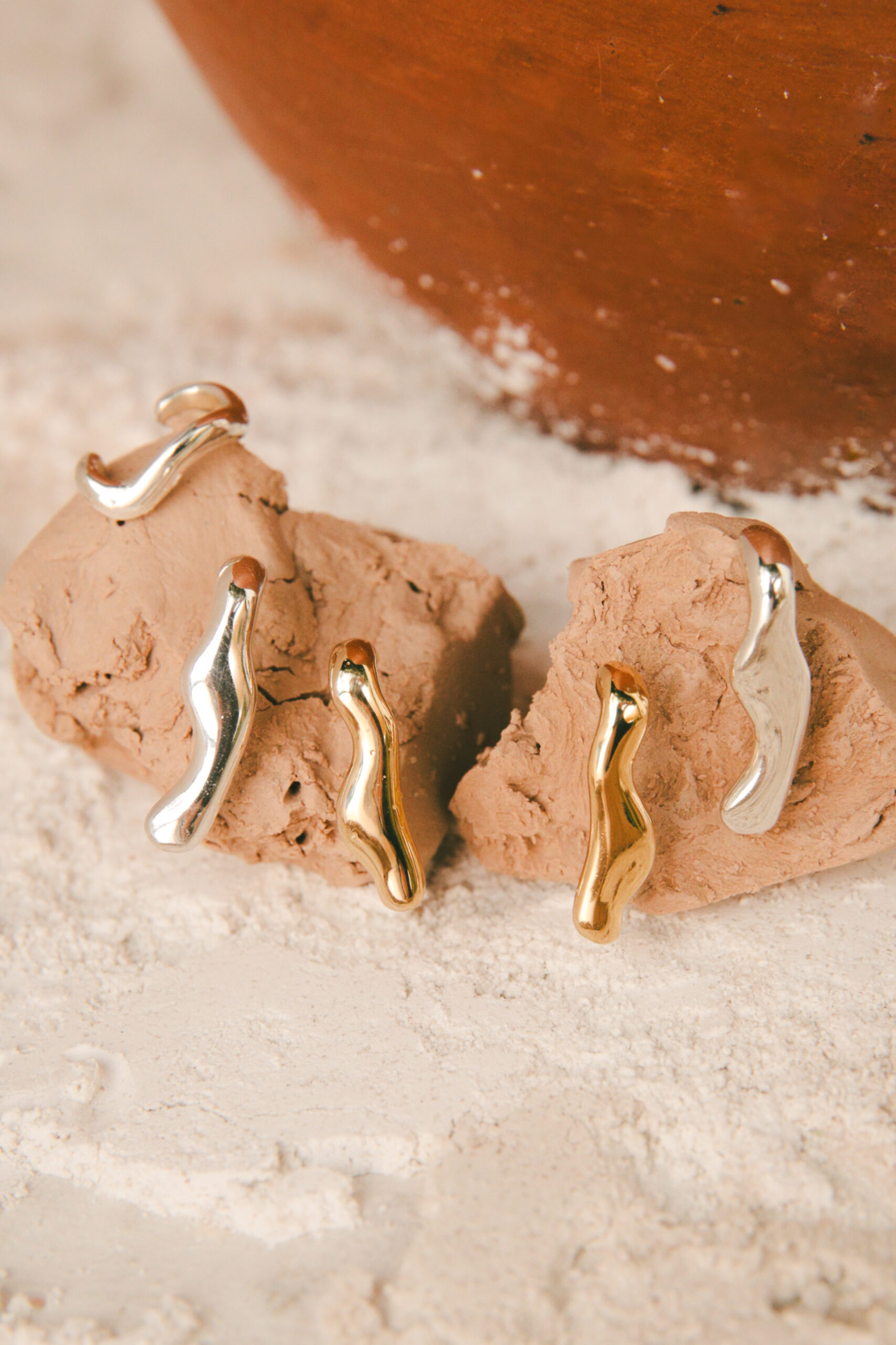 O brinco Solo é o conjunto de três (3) peças, um (1) par de brincos prata 925, um (1) par de brincos prata 925 banhado a ouro 18K e um (1) cuff prata 925.